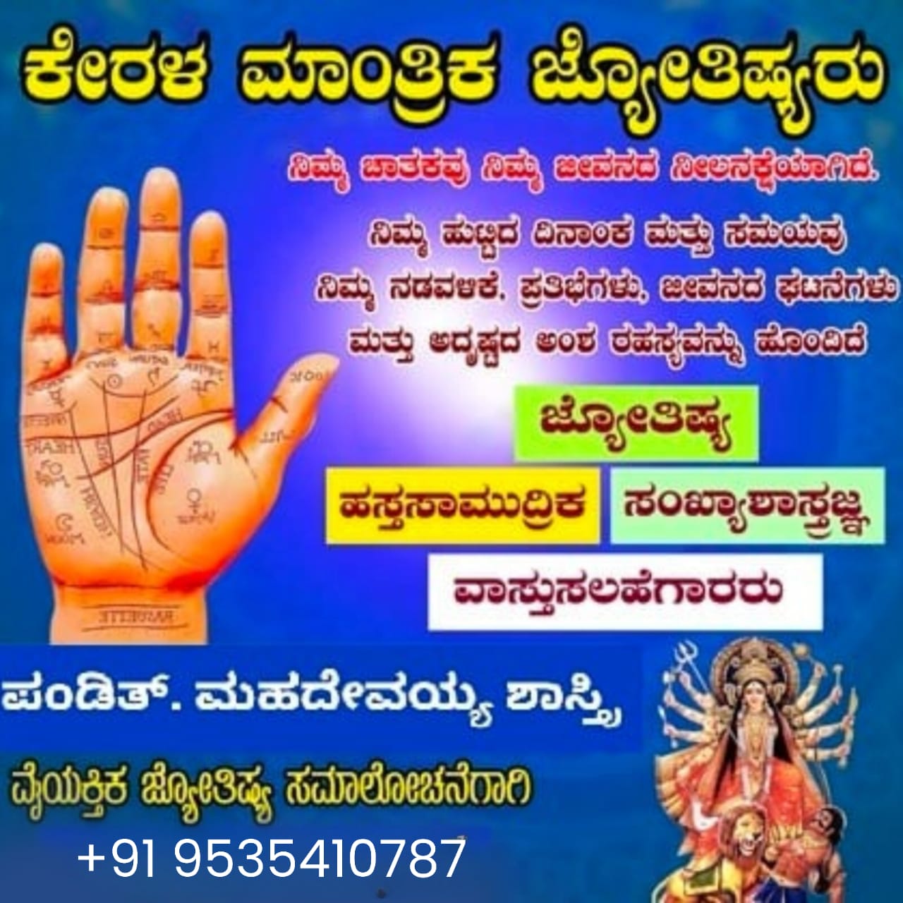 ಪಂಡಿತ್ ಮಹದೇವಯ್ಯ ಶಾಸ್ತ್ರಿ ಅವರು ಕೇರಳದಲ್ಲಿ ತಲೆಮಾರುಗಳಿಂದಲೂ ಜನರಿಗಾಗಿ ಕೆಲಸ ಮಾಡುತ್ತಿದ್ದಾರೆ ಮತ್ತು ಅತ್ಯುತ್ತಮ ಸೇವೆಗಳನ್ನು ಒದಗಿಸುತ್ತಿದ್ದಾರೆ ಮತ್ತು ಪ್ರಪಂಚದಾದ್ಯಂತ ಉತ್ತಮ ಗ್ರಾಹಕರನ್ನು ಹೊಂದಿದ್ದಾರೆ ಮತ್ತು ವಿದೇಶದಲ್ಲಿರುವ ಜನರು ತಮ್ಮ ಪರಿಹಾರಗಳನ್ನು ದೂರವಾಣಿ ಕರೆ ಮೂಲಕ ಪಡೆಯಬಹುದು. ಕೇವಲ ಒಂದು ಕರೆಯಲ್ಲಿ ಸೇವೆಯನ್ನು ಪಡೆಯಿರಿ ಮತ್ತು ನಿಮ್ಮ ಸಮಸ್ಯೆಯನ್ನು ಪೂರ್ಣಗೊಳಿಸಿ ಮತ್ತು ಧೂಳಿಪಟ ಮಾಡಿ. ಕೇರಳದ ಖ್ಯಾತ ಜ್ಯೋತಿಷಿ ಪಂಡಿತ್ ಮಹದೇವಯ್ಯ ಶಾಸ್ತ್ರಿ ಅವರ ಸಹಕಾರದೊಂದಿಗೆ.